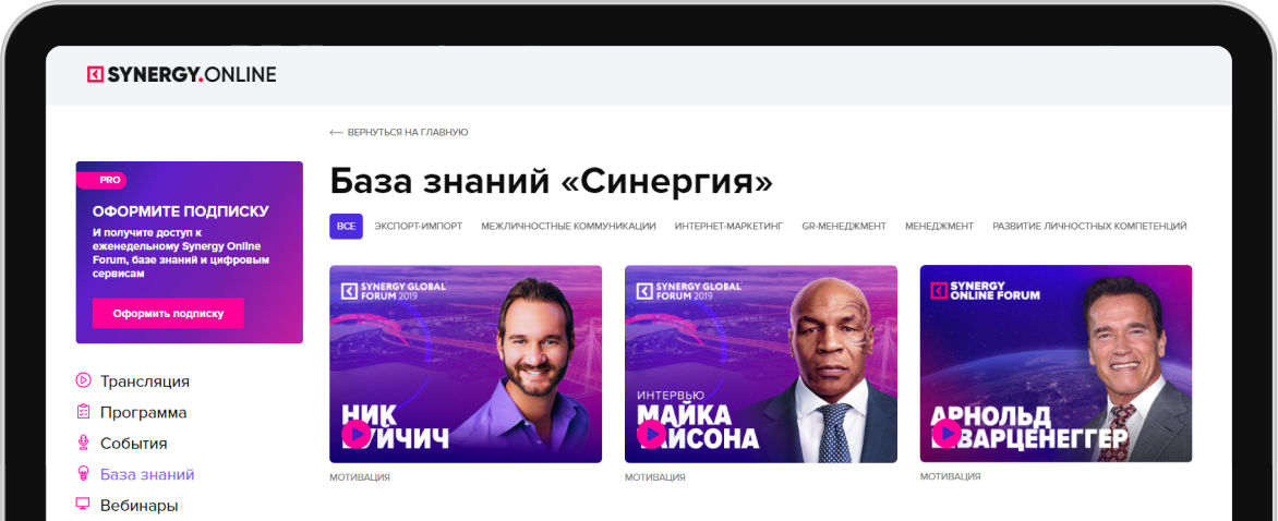 Оформите постоянную подписку на Synergy Online. Платформа предлагает 12 разных тарифов — выбирайте самый комфортный. Условия пакетов участия различаются, но суть в одном: чем выше тариф, тем шире доступ. Подробнее о составе и условиях подписки читайте в описании тарифов Synergy Online.